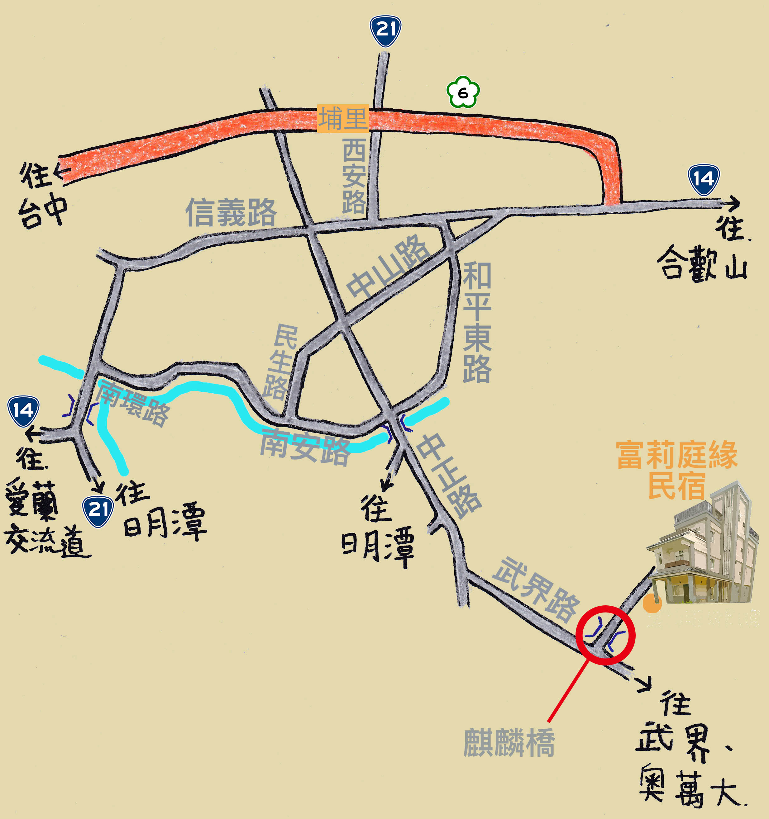 路線:國道六號34公里處埔里交流道 -> 左轉沿河堤直行 -> 右轉過橋沿西安路直行 -> 左轉信義路(台14公路) -> 右轉和平東路 -> 左轉中正路過橋後直行 -> 左轉武界路 -> 左轉麒麟橋 -> 直行約500公尺抵達(右側)
